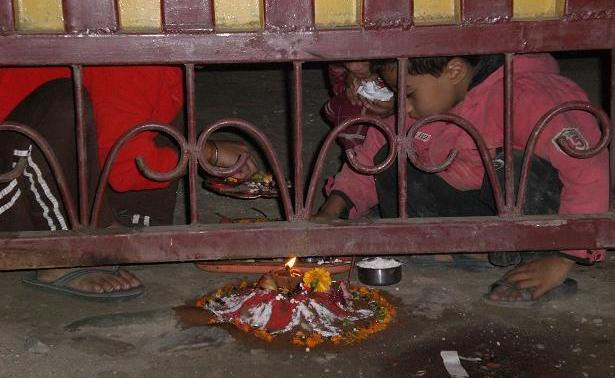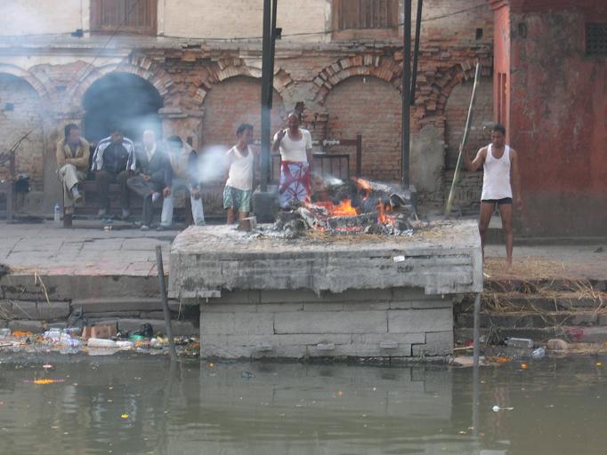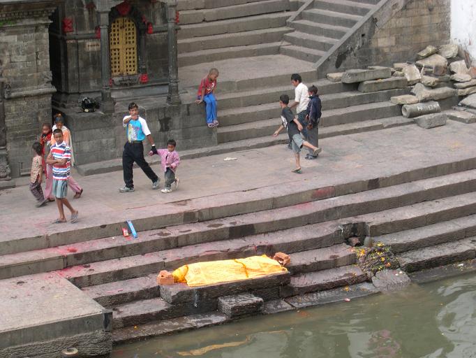 Am Bagmati Fluss liegt eine Leiche, die später verbrannt wird.