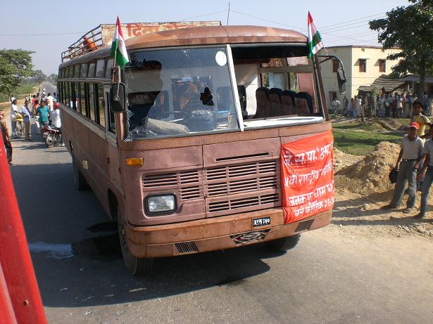 Der gleiche Ort. Reisebus mit eingeworfenen Scheiben.