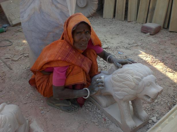 Poliererin, die den Sandstein auf Hochglanz bringt.