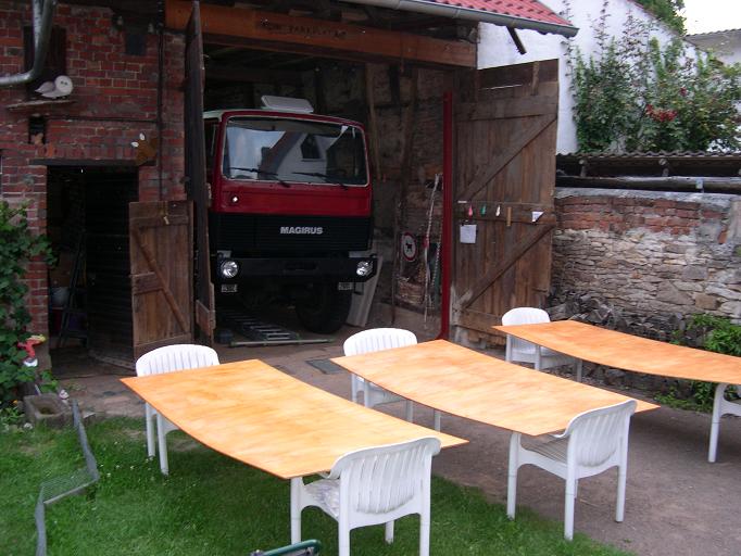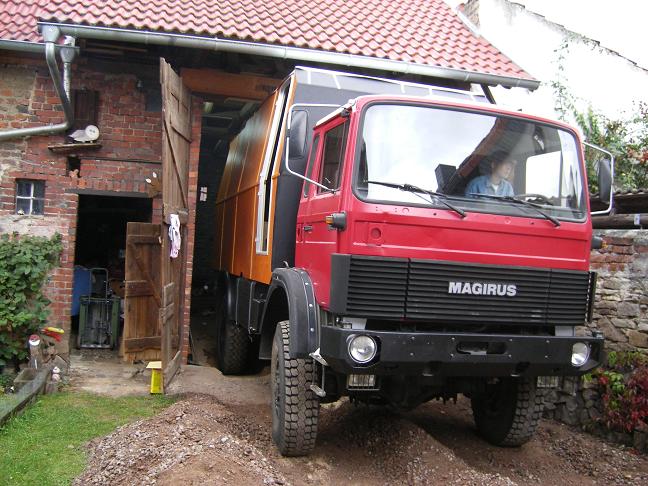 Wie 2001 fahren wir den Magirus in die Scheune. Die Farbe ist