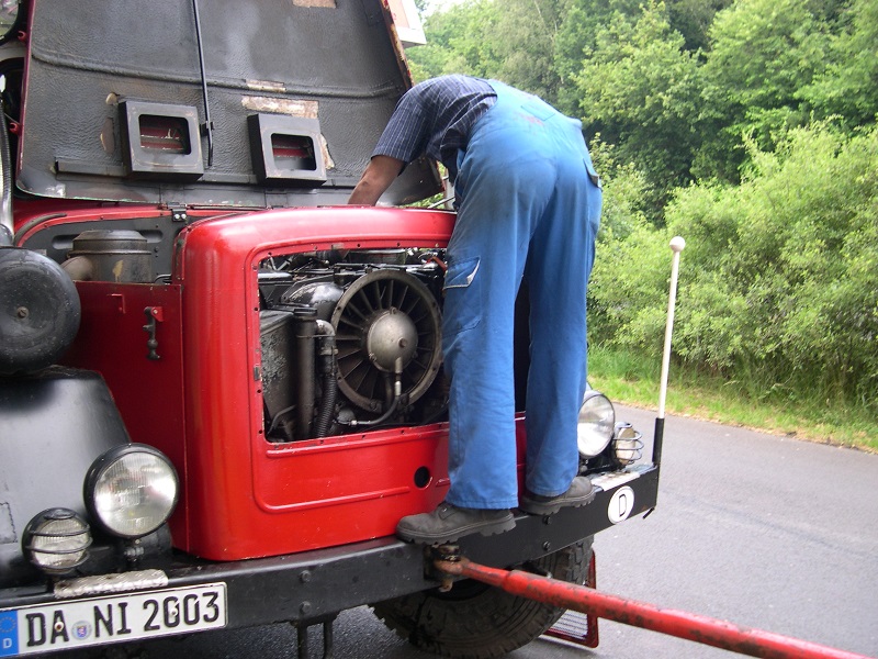 | Der ADAC Mann schließt den Druckluftschlauch für die Bremsanlage an. Damit steht es 2:0 für Scania. |