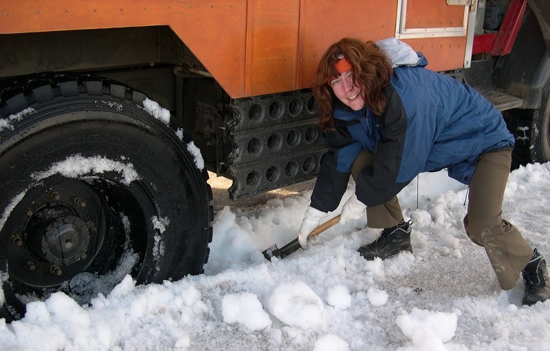 | Manchmal gehts durch Schnee und Eisreste. Hier hängen wir fest. Über 2 Stunden hat Dani geschaufelt um den Magirus wieder frei zu kriegen. Mir sind die Finger fast abgefroren beim fotografieren. |