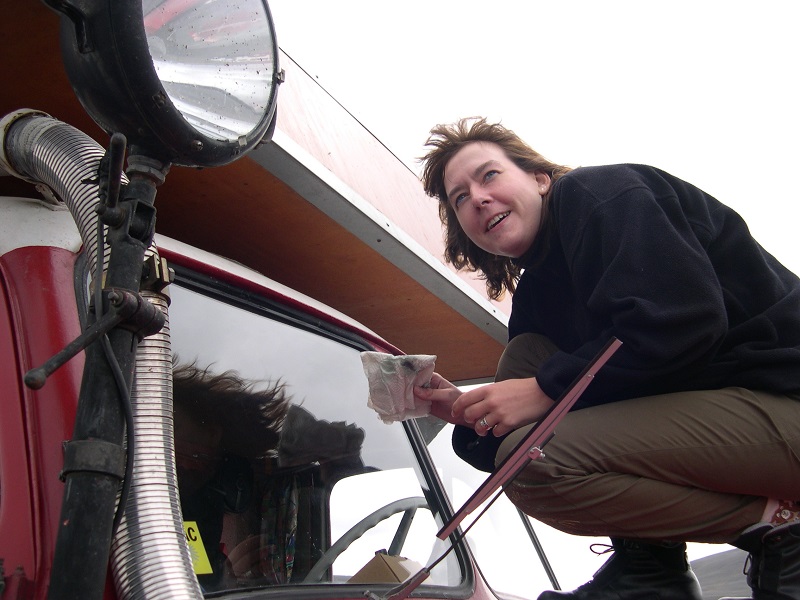 der Hitze. Dani beim reinigen der Windschutzscheibe. Mit Schuhen auf der Motorraumhaube. |