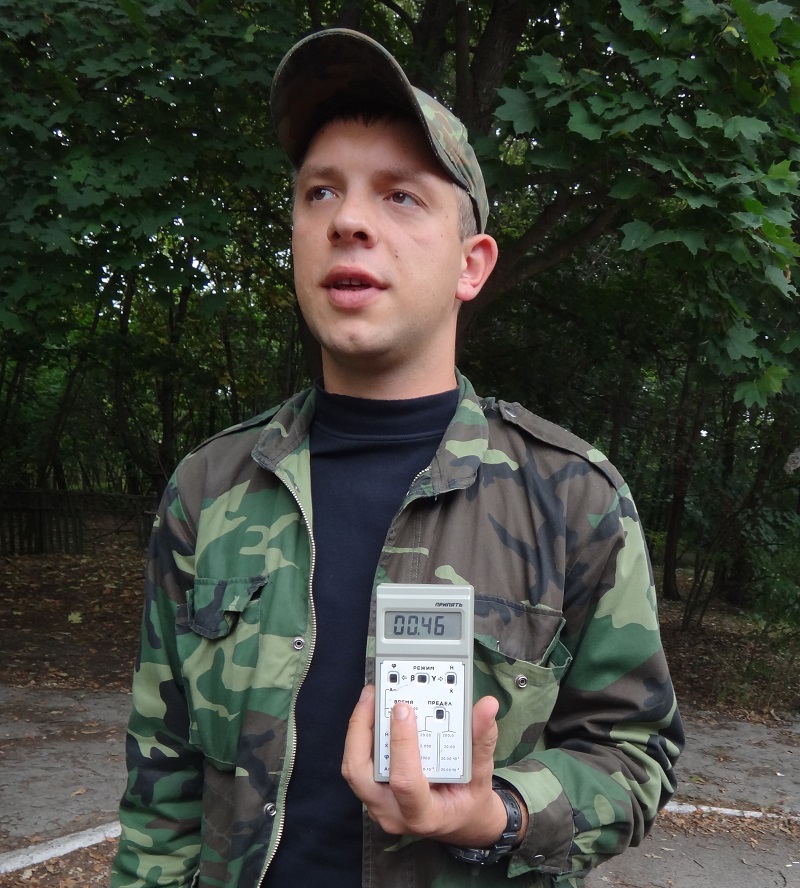 Guide (Juri) hat einen Geigerzähler. Wir lernen, dass Abstand halten im