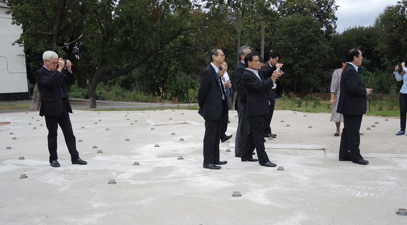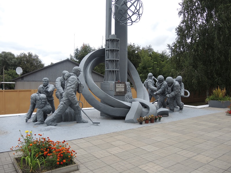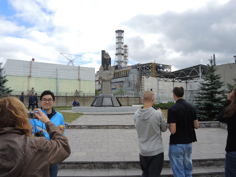 | Block 4, davor ein Denkmal (für die heldenhaften Liquidatoren - die die Welt vor größerem Schäden bewahrt haben), davor Touristen, die sich vor dem Denkmal und Block 4 ablichten lassen. |