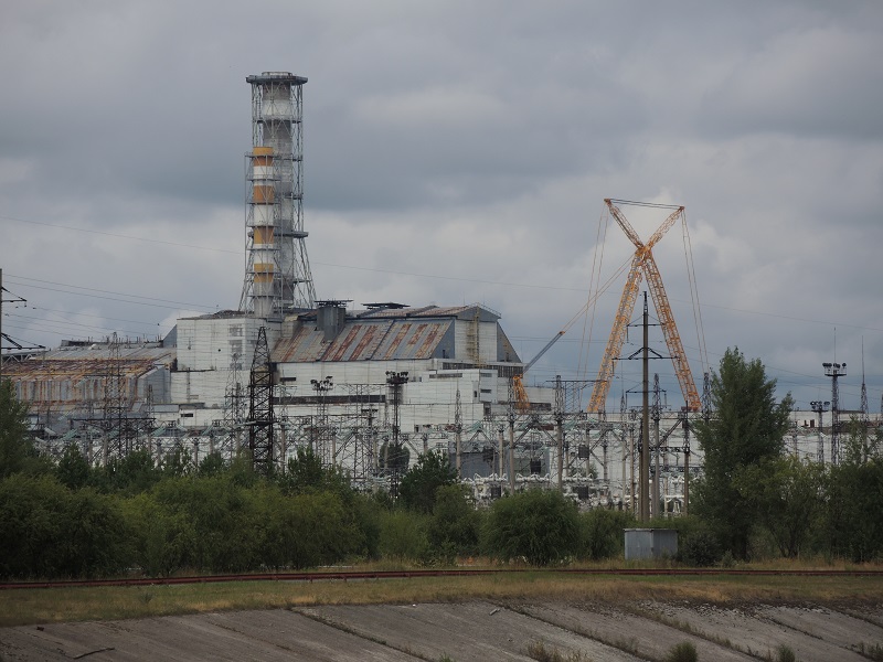 | Das Kraftwerk selbst liegt ausserhalb der Stadt. Hier ein Blick auf den havarierten Block 4 aus der Ferne: |